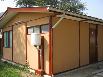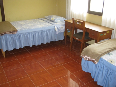 Dormitorio con tres camas individuales, baño completo con agua caliente, el servicio incluye sábanas, frazadas y toallas.