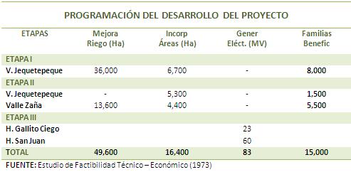 El esquema hidráulico del Proyecto y sus principales Obras, se han adecuado al aprovechamiento de los recursos hídricos disponibles de las cuencas de los ríos Jequetepeque y Zaña de la vertiente Occidental (y Cajamarca y Namora de la vertiente oriental de los andes nor-peruanos); y, conforme con la prioridades, el desarrollo y construcción de las obras de su infraestructura hidráulica mayor, el desarrollo del proyecto fue programado en tres Etapas: